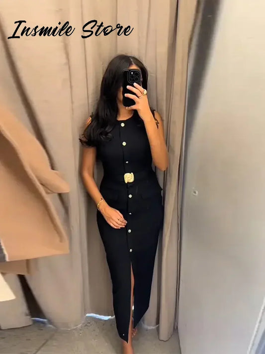 Elegant Black With Belt Women Dress O-neck Sleeveless Single Breasted Slim Female Maxi Dresses 2025 Summer New Chic Lady Robe